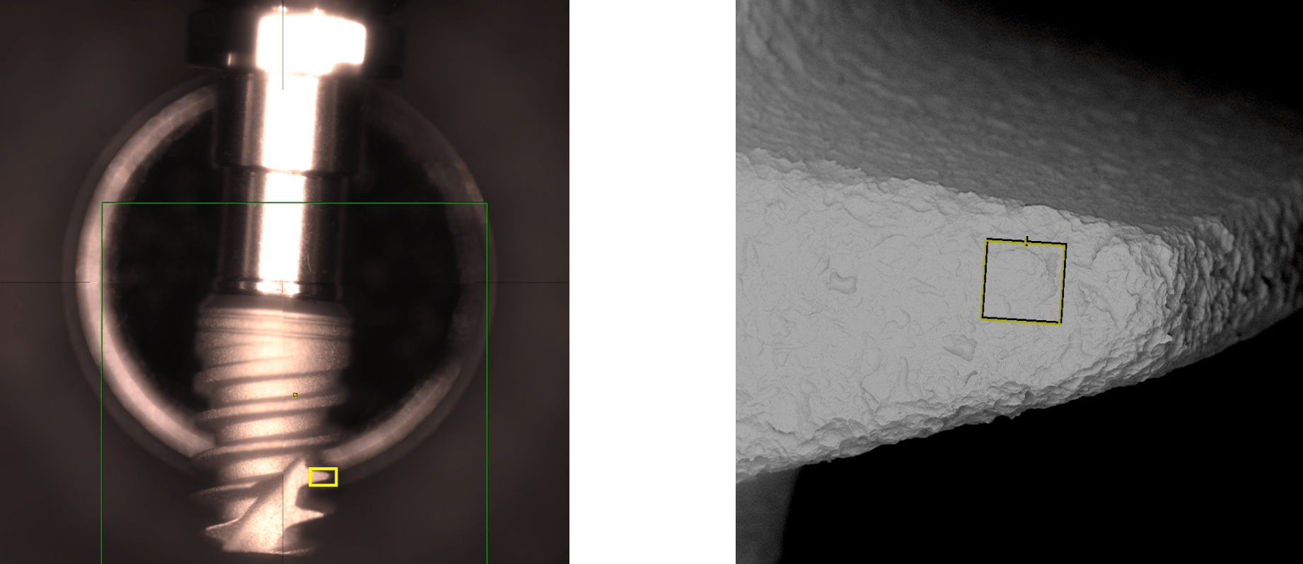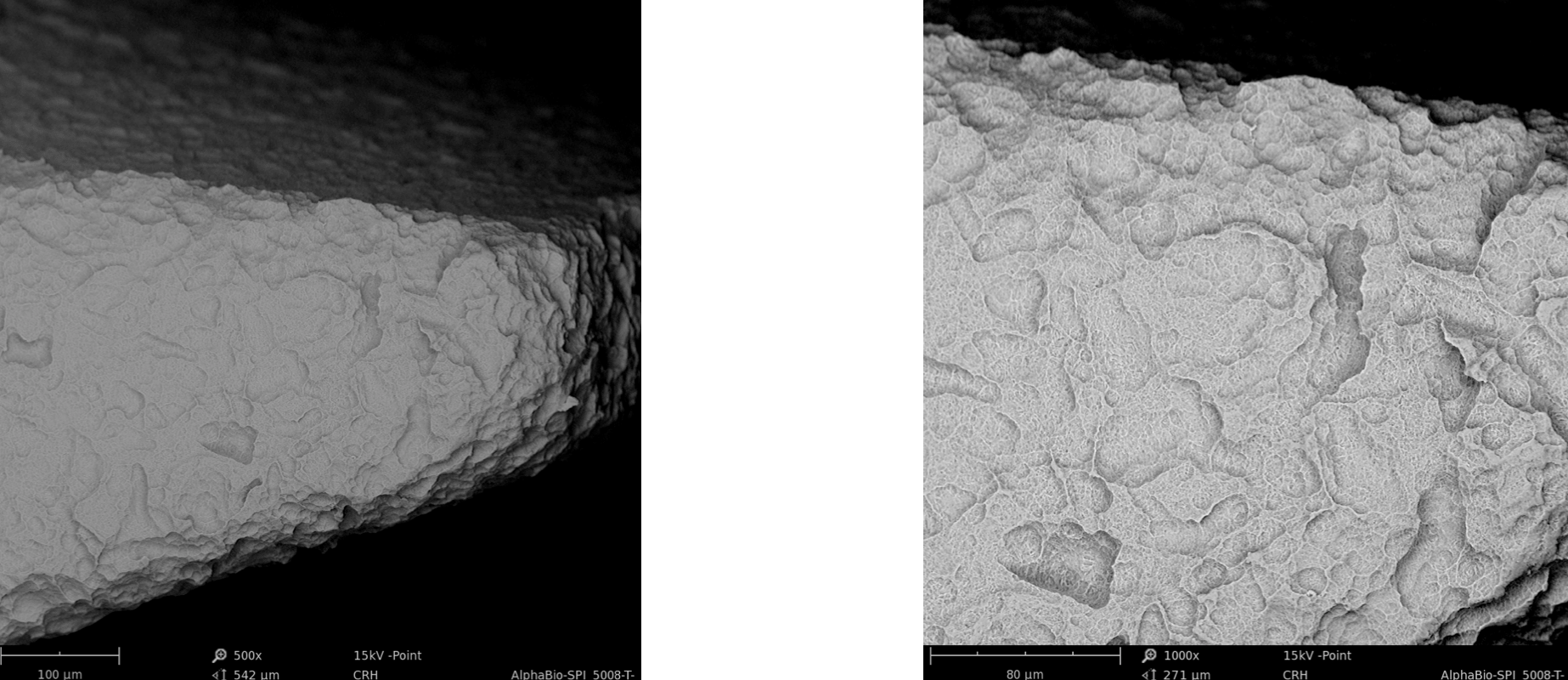 Scanning electron microscopy (SEM) enables the topical evaluation of the implant surface. In particular at low voltages and small working distances, images with high contrast can be obtained. The high-sensitivity backscattered electron detector is generating images in compositional and topographical modes to a magnification of 20.000x.