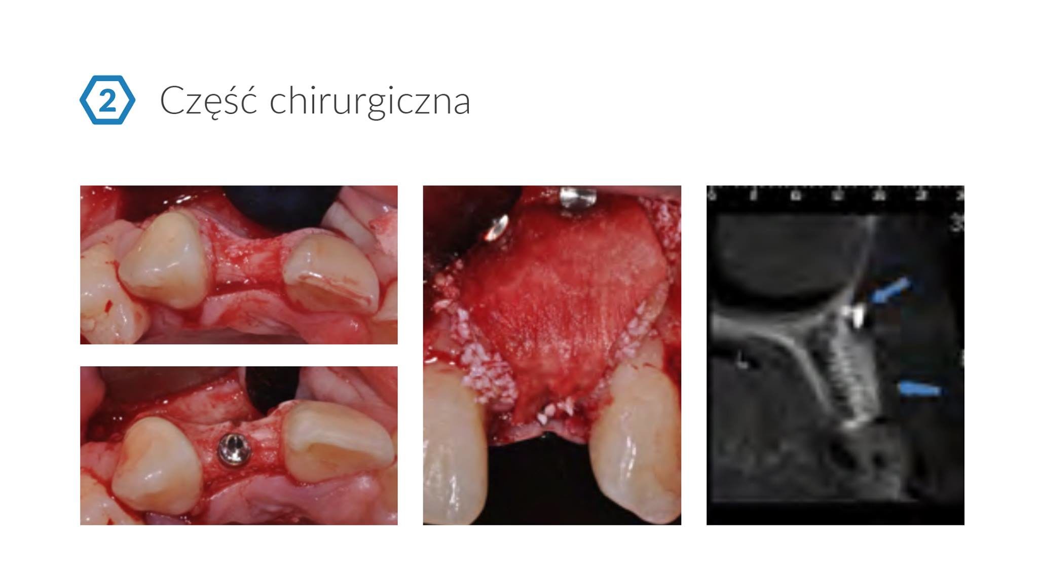 Po przeprowadzeniu dokładnej diagnostyki (RTG, CBCT) podjęto decyzję o wszczepieniu wąskiego implantu o średnicy 3.2 mm ( NICE Alpha-Bio Tec.) oraz o przeprowadzeniu jednocześnie sterowanej regeneracji kości (GBR) w części przedsionkowej wyrostka zębodołowego.