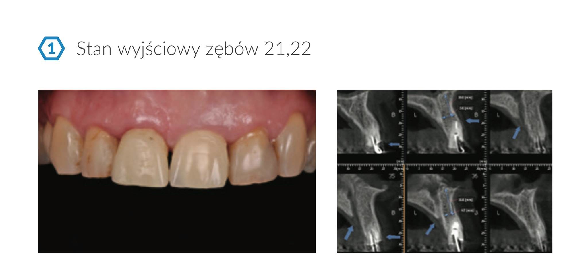 59-letnia pacjentka zgłosiła się do gabinetu, chcąc poprawić warunki estetyczne w odcinku zębów przednich. Po klinicznej i radiologicznej ocenie stwierdzono, że zęby 21 i 11 nie nadają się do odbudowy metodami standardowymi i zostały zakwalifikowane do usunięcia.Diagnostyka CBCT wykazała doskonały stan wyrostka zębodołowego, zarówno jeżeli chodzi o jego szerokość jak i wysokość, odpowiedni do przeprowadzenia zabiegu natychmiastowego wszczepienia implantów w dniu ekstrakcji zębów. Stwierdzono brak zmian okołowierzchołkowych oraz innych mogących być przeciwwskazaniem do wykonania zabiegu.Zaproponowano pacjentce ekstrakcję zębów z jednoczesnym wykonaniem zabiegu natychmiastowej implantacji z natychmiastowym obciążeniem uzupełnieniem tymczasowym.Po wykonaniu pomiarów zdecydowano się na zastosowanie dwóch implantów NeO o średnicy Ø3,5 i długości 11.5 mm.