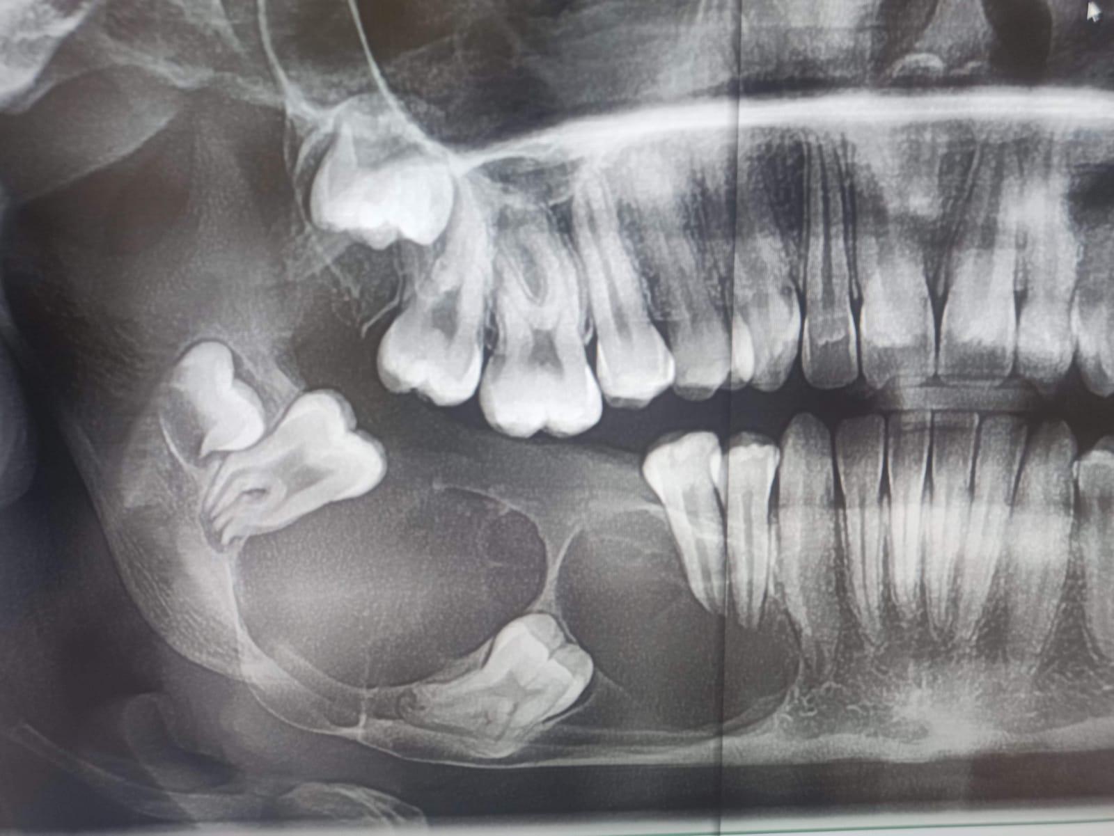 Pacjentka lat 15, zgłosiła się do poradni chirurgii szczękowo - twarzowej Szpitala Specjalistycznego im. L. Rydygiera w Krakowie z powodu rozległego guza trzonu, kąta i gałęzi żuchwy po stronie prawej. Na wykonanym zdjęciu ortopantomograficznym (OPG) uwidoczniono rozległy wielokomorowy ubytek kości żuchwy z całkowicie zatrzymanym zębem 46 w jego świetle oraz zepchnięciem zębów 47,48 w kierunku gałęzi żuchwy (Fig. 1.). W  badaniu tomografii komputerowej uwidoczniono guz zniekształcający kość żuchwy po stronie prawej z jej rozdęciem i niszczeniem blaszki korowej od strony zewnętrznej oraz wewnętrznej (Fig. 2.). Wynik badania histopatologicznego pobranych wycinków z guza potwierdził rozpoznanie szkliwiaka (typ pęcherzykowo-akantomatyczny).