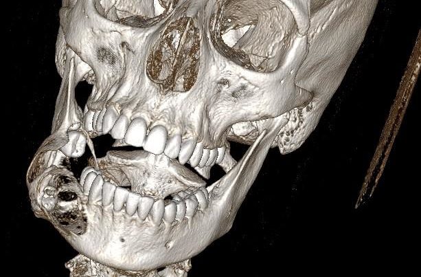 Fig. 2.Obraz w rekonstrukcji 3D badania tomografii komputerowej części twarzowej czaszki– widoczny guz powodujący znaczne zniekształcenie żuchwy po stronie prawej ze zniszczeniem blaszki korowej kości