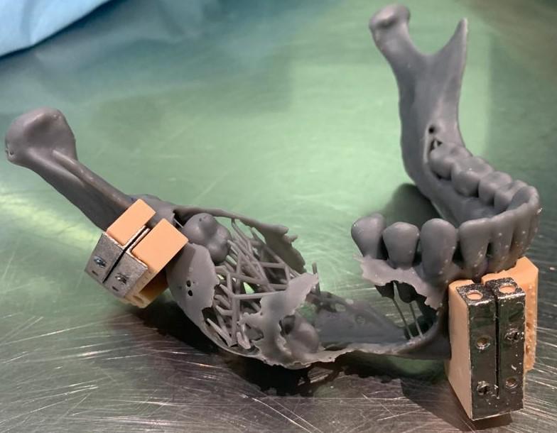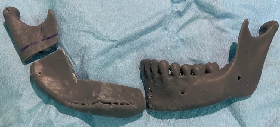 Fig. 5. Przecięte modele stereolitograficzne żuchwy oraz talerza kości biodrowej w oparciu o indywidualne szablony chirurgiczne