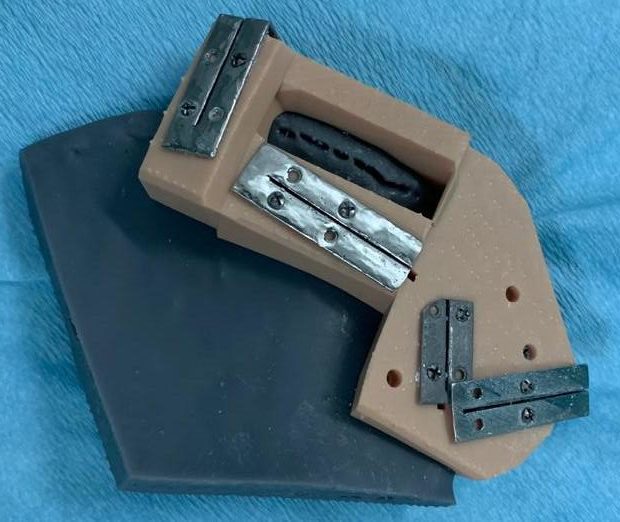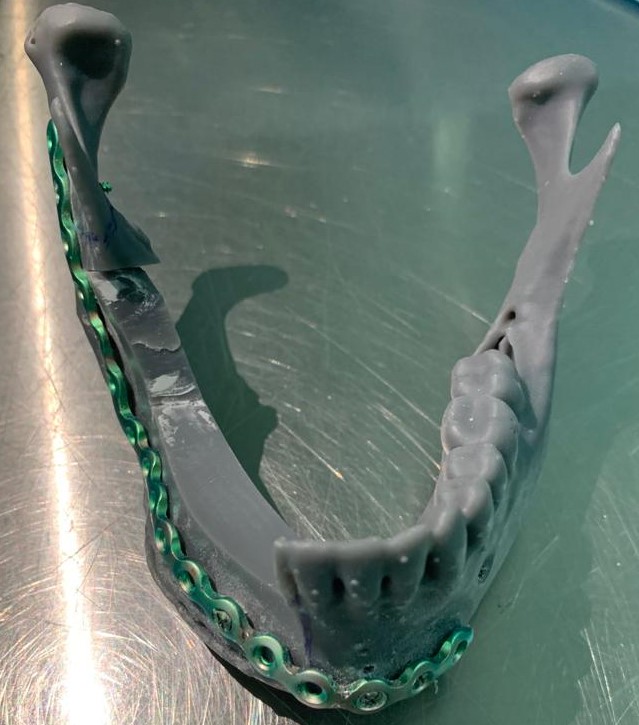 W związku z rozpoznaniem szkliwiaka u chorej zaplanowano zabieg resekcji odcinkowej żuchwy w zakresie od zęba 42 do podstawy wyrostka kłykciowego po stronie prawej z jednoczasową rekonstrukcją wolnym płatem mikronaczyniowym z talerza kości biodrowej prawej. W okresie przedoperacyjnym na podstawie wykonanych badań tomografii komputerowej wydrukowano modele stereolitograficzne żuchwy i prawego talerza kości biodrowej oraz zaprojektowano indywidualne szablony chirurgiczne do resekcji żuchwy oraz pobrania płata z kości biodrowej (Fig. 3.,4.,5.). Na modelu stereolitograficznym dogięto mini-płytkę rekonstrukcyjną celem wykorzystania w trakcie trwania zabiegu do osteosyntezy płata kostnego (Fig. 6.). Zaplanowano również jednoczasowe wprowadzenie 3 implantów zębowych firmy Alpha Bio w przenoszoną kość, dlatego też wykonano implantologiczny szablon chirurgiczny (Fig. 7.).