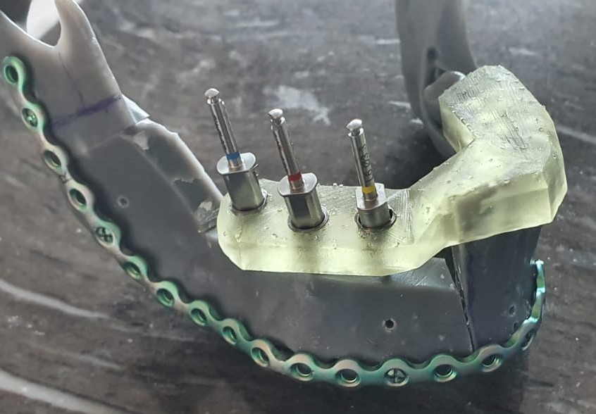 Fig. 7. Szablon implantologiczny przygotowany celem jednoczasowego założenia 3 implantów zębowym w przenoszony fragment talerza kości biodrowej