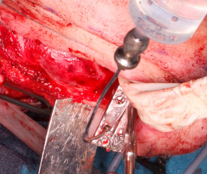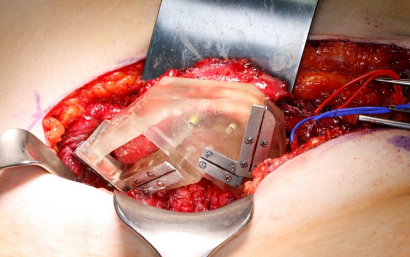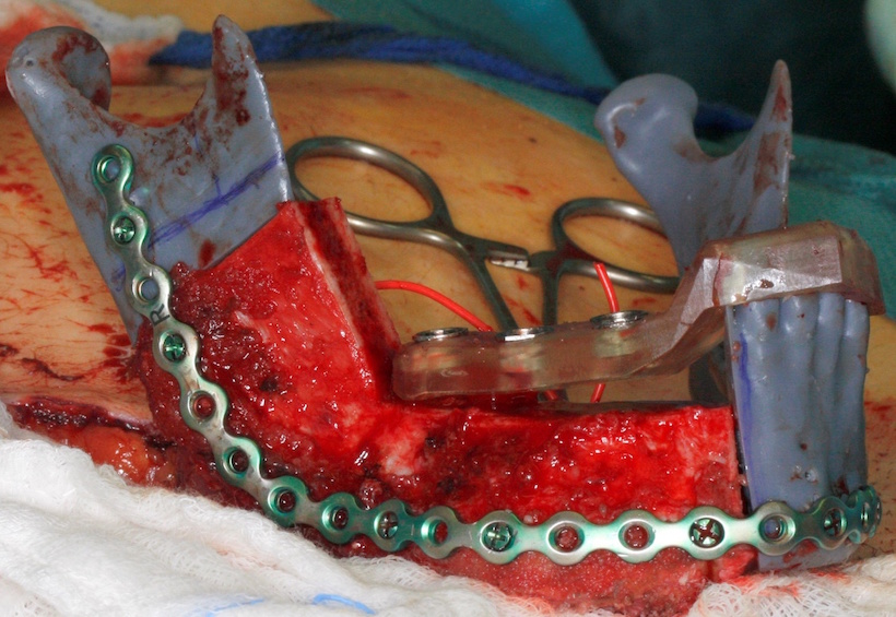Jednoczasowo wypreparowano wolny płat mikronaczyniowy z prawego talerza biodrowego oparty na naczyniach okalających biodro głębokich (DCIAF), wycinając go z kolcem biodrowym przednim górnym w kształcie litery L o wymiarach 3 cm x 6 cm przy użyciu wcześniej przygotowanego szablonu chirurgicznego indywidualnego, odwzorowującego wiernie zresekowany fragment żuchwy (Fig. 11., 12.). Przed odcięciem szypuły płata do części grzebienia biodrowego odtwarzającego trzon żuchwy wprowadzono 3 implanty firmy Alpha Bio MultiNeo CS średnicy 4,2 mm i długości 10mm przy użyciu szablonu chirurgicznego, uzyskując ich stabilizację pierwotną (Fig. 13., 14., 15., 16., 17.). Po przygotowaniu do mikrozespoleń naczyń okalających biodro głębokich Fig. 18.), płat mikrochirurgiczny przeniesiono w miejsce zresekowanej żuchwy i unieruchomiono minipłytką rekonstrukcyjną tytanową dogiętą na modelu stereolitograficznym uzyskując pełną jego stabilizację (Fig. 19). Następnie zespolono tętnicę okalającą biodro głęboką z tętnicą twarzową prawą, uzyskując prawidłową reperfuzję płata zarówno w części kostnej jak i w mięśniach oraz wypływ krwi żylnej z żyły okalającej biodro głębokiej, którą zespolono z prawą żyłą twarzową (Fig.20.).