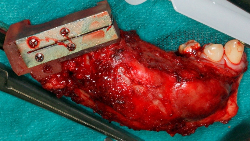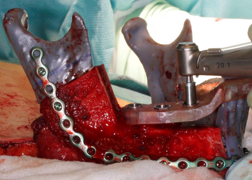Fig. 9. Resekcja w zakresie trzonu żuchwy z użyciem indywidualnego szablony chirurgicznego