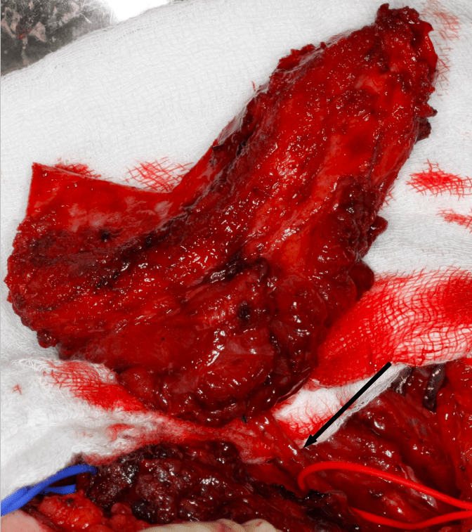 Fig. 8. Wypreparowany z dostępu zewnątrzustnego guz żuchwy po stronie prawej (strzałka)