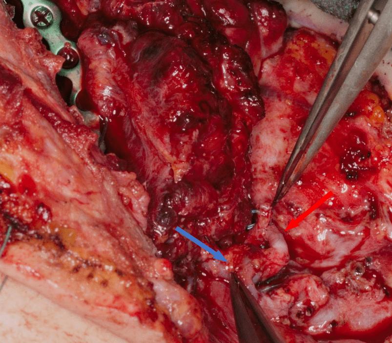 Fig. 20. Wykonane mikroanastomozy tętnicza (strzałka czerwona) oraz żylna (strzałka niebieska)