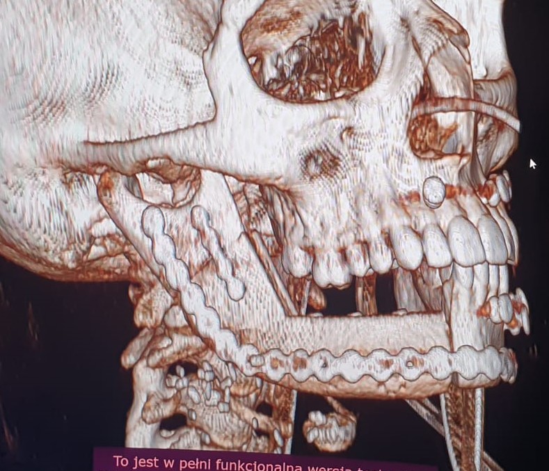 W okresie pooperacyjnym nie stwierdzono powikłań w gojeniu ran pooperacynych. W wykonanych badaniach tomografii komputerowej części twarzowej czaszki (Fig. 21.) oraz OPG (Fig. 22.) potwierdzono poprawność rekonstrukcji żuchwy oraz prawidłową pozycję jednoczasowo założonych implantów. Po upływie 6 miesięcy od wykonanego zabiegu chirurgicznego i pełnym zrośnięciem się kikutów żuchwy z płatem mikrochirurgicznym z talerza kości biodrowej oraz osteointegracji implantów zębowych z przenoszonym fragmentem kostnym w chorej planowane są dalsze etapy leczenia implantoprotetycznego.