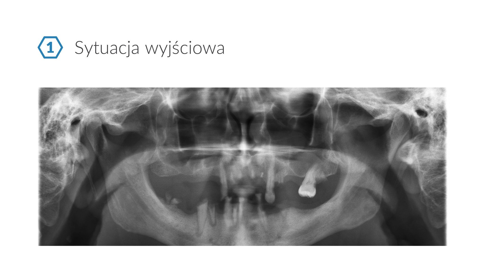 Na podstawie wykonanego badania klinicznego oraz zdjęcia pantomograficznego zęby i ich korzenie obecne w jamie ustnej zakwalifikowano do usunięcia. Zabieg sanacji wykonano w warunkach znieczulenia miejscowego podczas jednej wizyty. Następnie wykonano wczesne całkowite protezy osiadające.