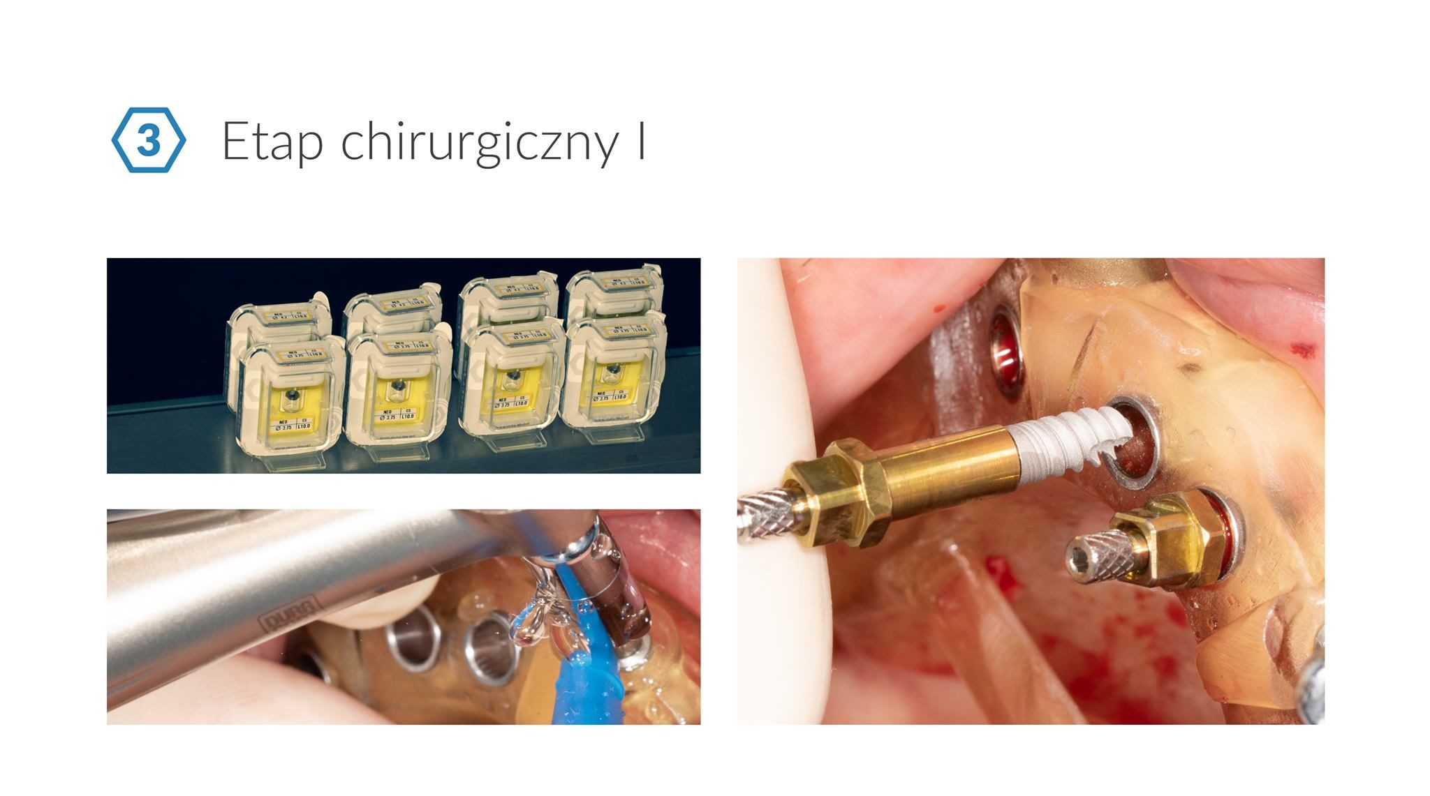 W znieczuleniu miejscowym podczas jednej wizyty wszczepiono 8 implantów NeO Alpha-Bio Tec. Dental Implants- Global z wykorzystaniem kasety GSTK, uzyskując wysokie stabilizacje pierwotne wszczepów. W pierwszym etapie wszczepiono implanty w szczęce.